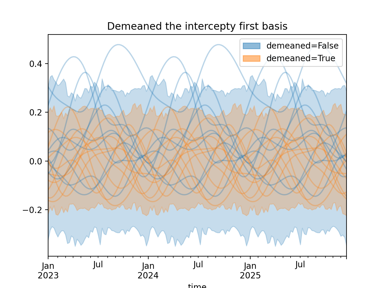 import numpy as np import pandas as pd import xarray as xr import matplotlib.pyplot as plt from pymc_marketing.mmm import HSGPPeriodic from pymc_marketing.plot import plot_curve seed = sum(map(ord, "Periodic GP")) rng = np.random.default_rng(seed) scale = 0.25 ls = 1 kwargs = dict(ls=ls, scale=scale, period=52, cov_func="periodic", dims="time", m=20) n = 52 * 3 dates = pd.date_range("2023-01-01", periods=n, freq="W-MON") X = np.arange(n) coords = {"time": dates} hsgp = HSGPPeriodic(demeaned_basis=False, **kwargs).register_data(X) hsgp_demeaned = HSGPPeriodic(demeaned_basis=True, **kwargs).register_data(X) def sample_curve(hsgp): return hsgp.sample_prior(coords=coords, random_seed=rng)["f"] non_demeaned = sample_curve(hsgp).rename("False") demeaned = sample_curve(hsgp_demeaned).rename("True") combined = xr.merge([non_demeaned, demeaned]).to_array("demeaned") _, axes = combined.pipe(plot_curve, "time", same_axes=True) axes[0].set(title="Demeaned the intercepty first basis") plt.show()