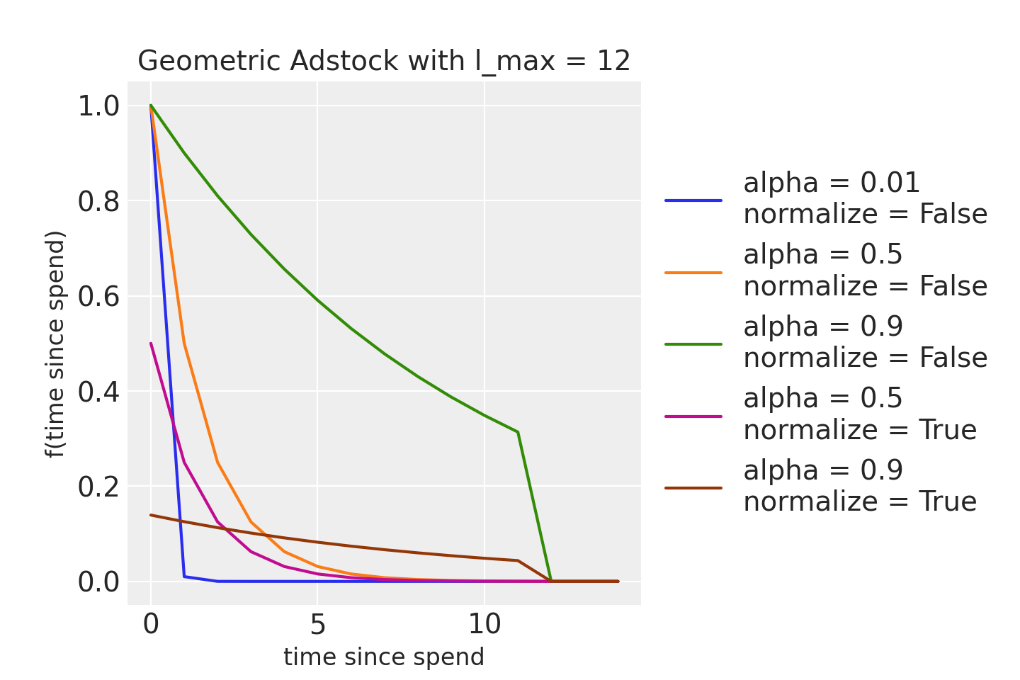 Adstock with geometric decay assumes advertising effect peaks at the same time period as ad exposure. The cumulative media effect is a weighted average of media spend in the current time-period (e.g. week) and previous l_max - 1 periods (e.g. weeks). l_max is the maximum duration of carryover effect.