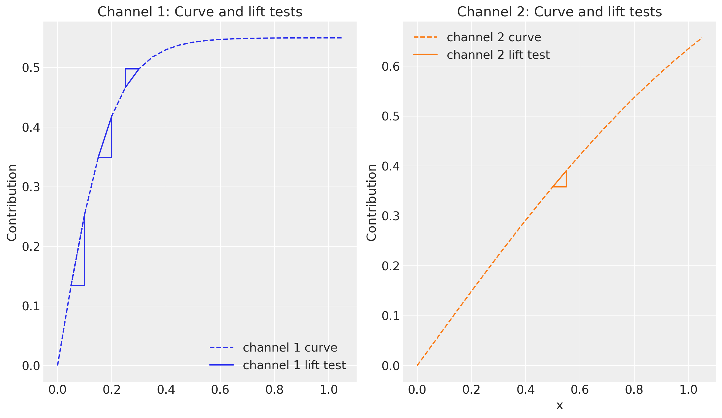 An experiment characterized in this way can be viewed as two points on the saturation curve for the channel. Accordingly, lift test calibration is implemented by adding a term to the model likelihood, that makes the channel saturation curve (the contribution as a function of spend) align with the test observation.