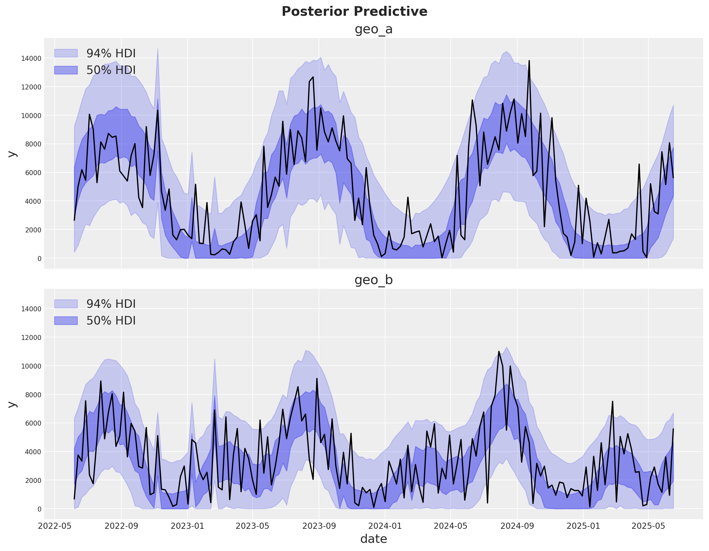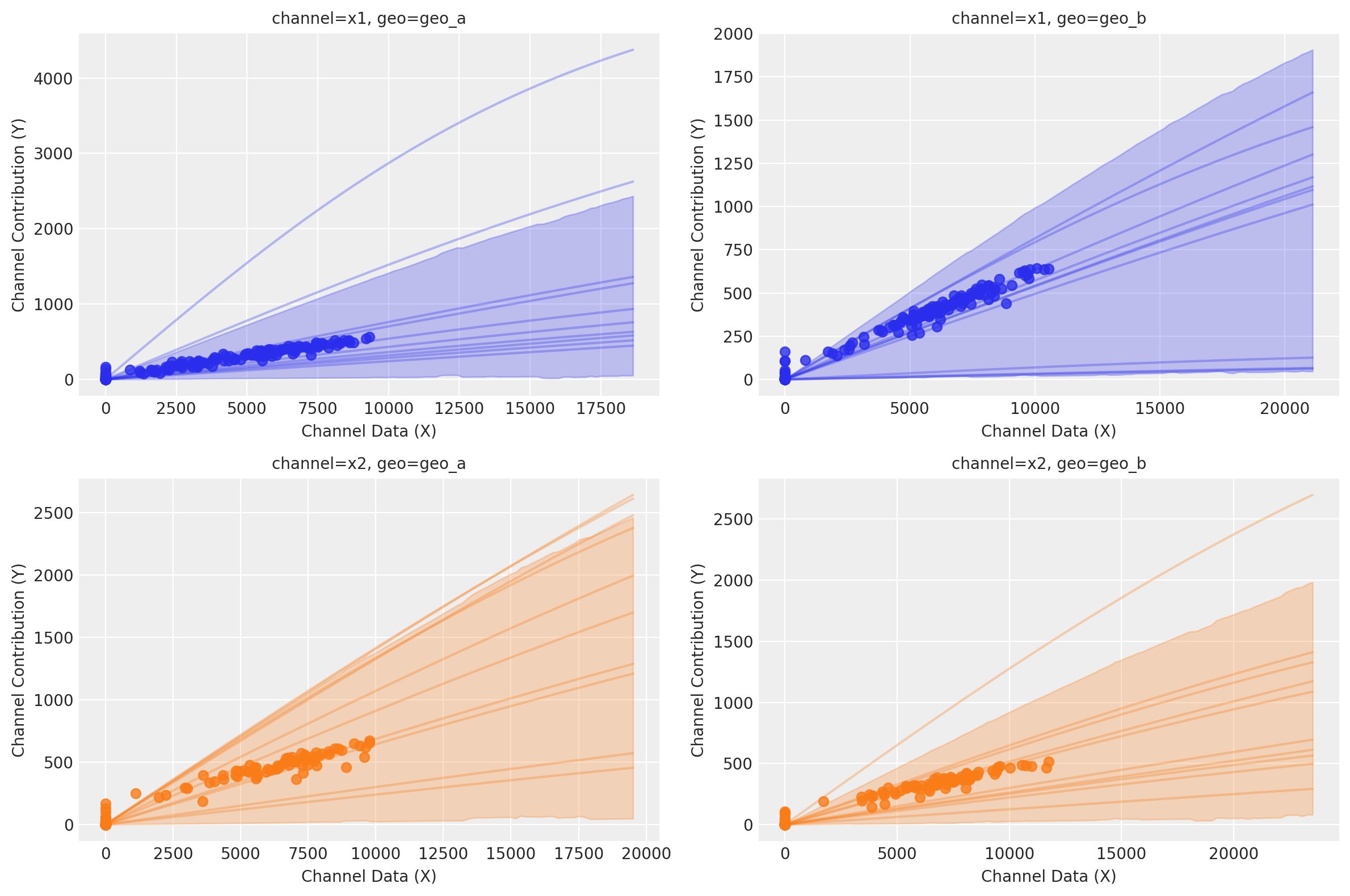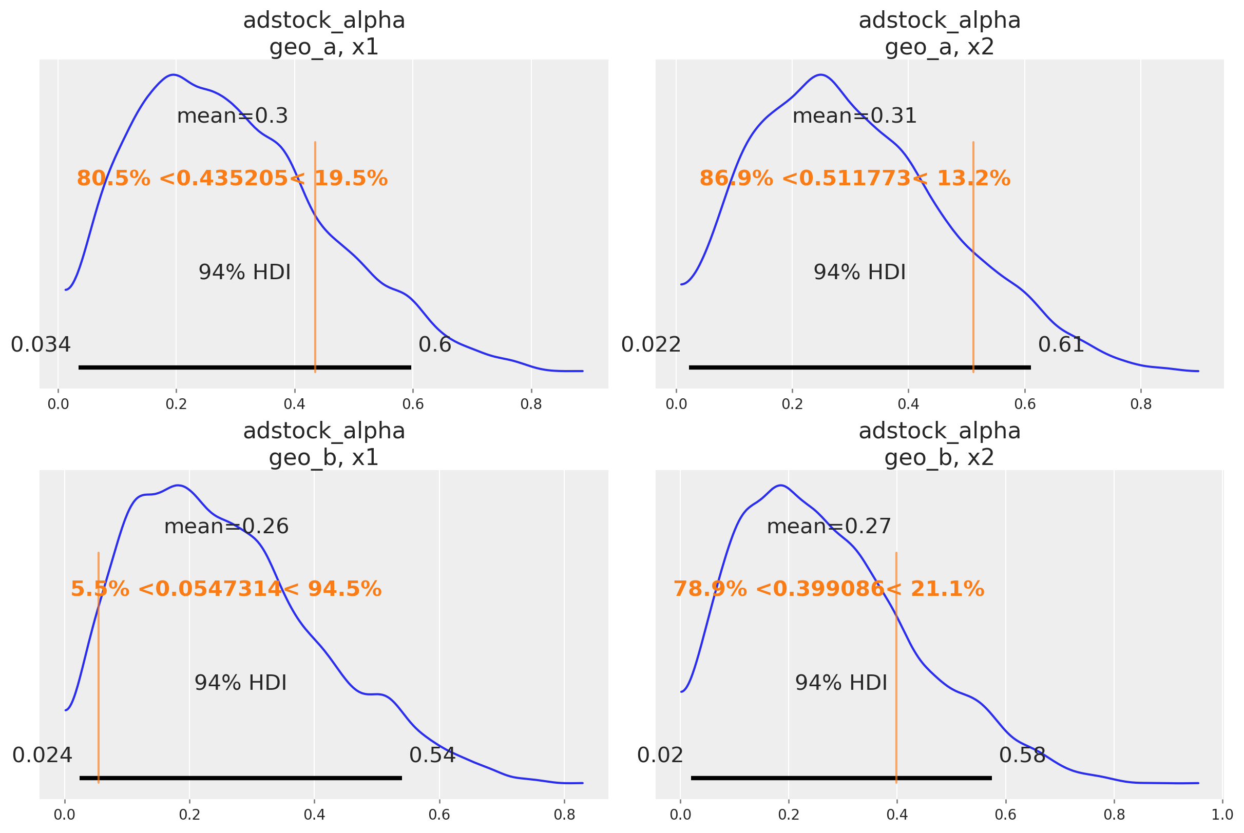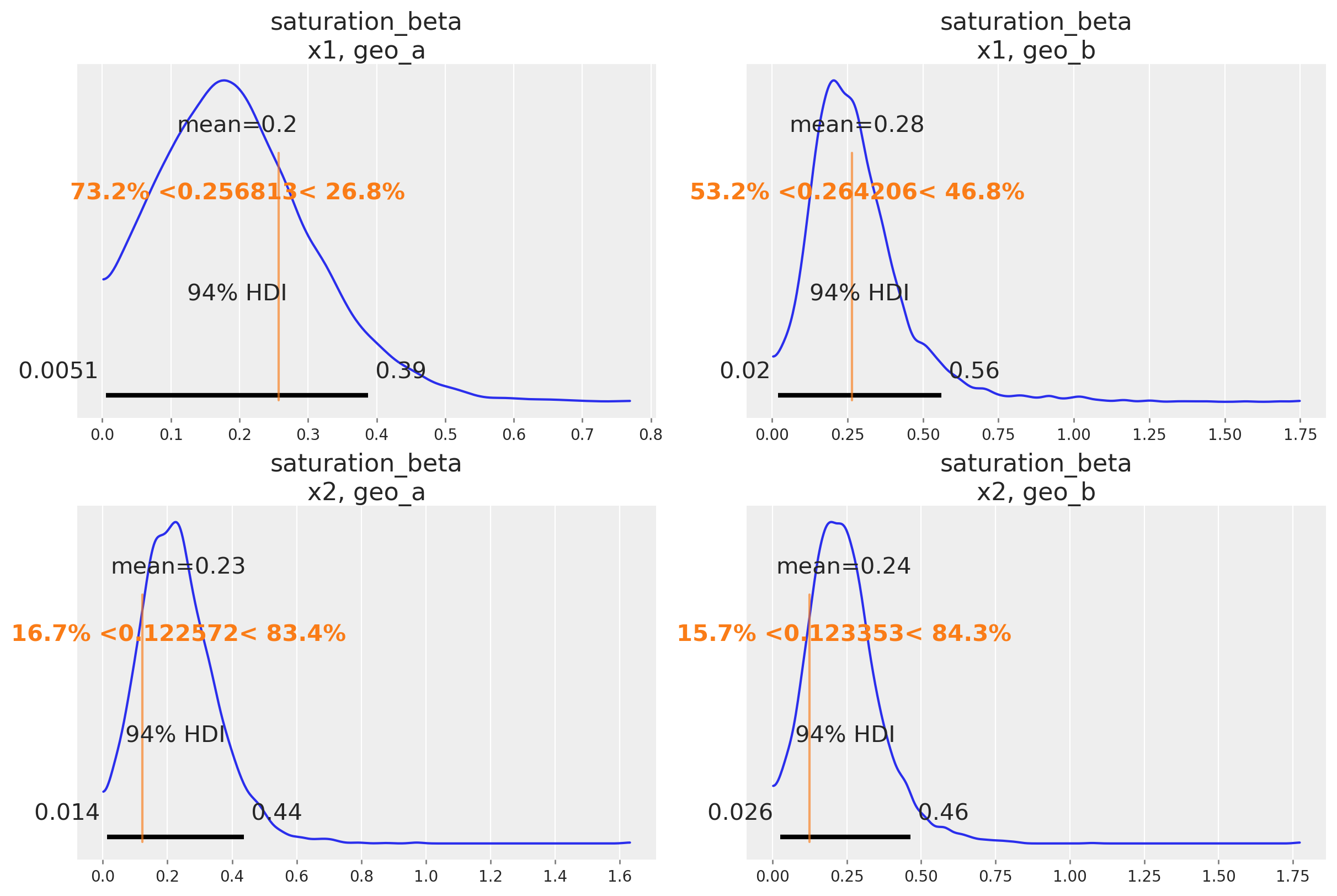 A hierarchical model does something clever - instead of assuming that every geography is different, we assume that they must be at least partially related to each other. If you had 10 geos and 9 of them had a high saturation point, you would reasonably expect the 10th one to have a high saturation point. A hierarchical model will adaptively pool information between contexts. When each geo is very different, it will transfer less information between them. When each geo is very similar, it will transfer more information. This is also called partial pooling. If you need an introduction on Bayesian hierarchical models, check out the comprehensive example “A Primer on Bayesian Methods for Multilevel Modeling” in the PyMC documentation.