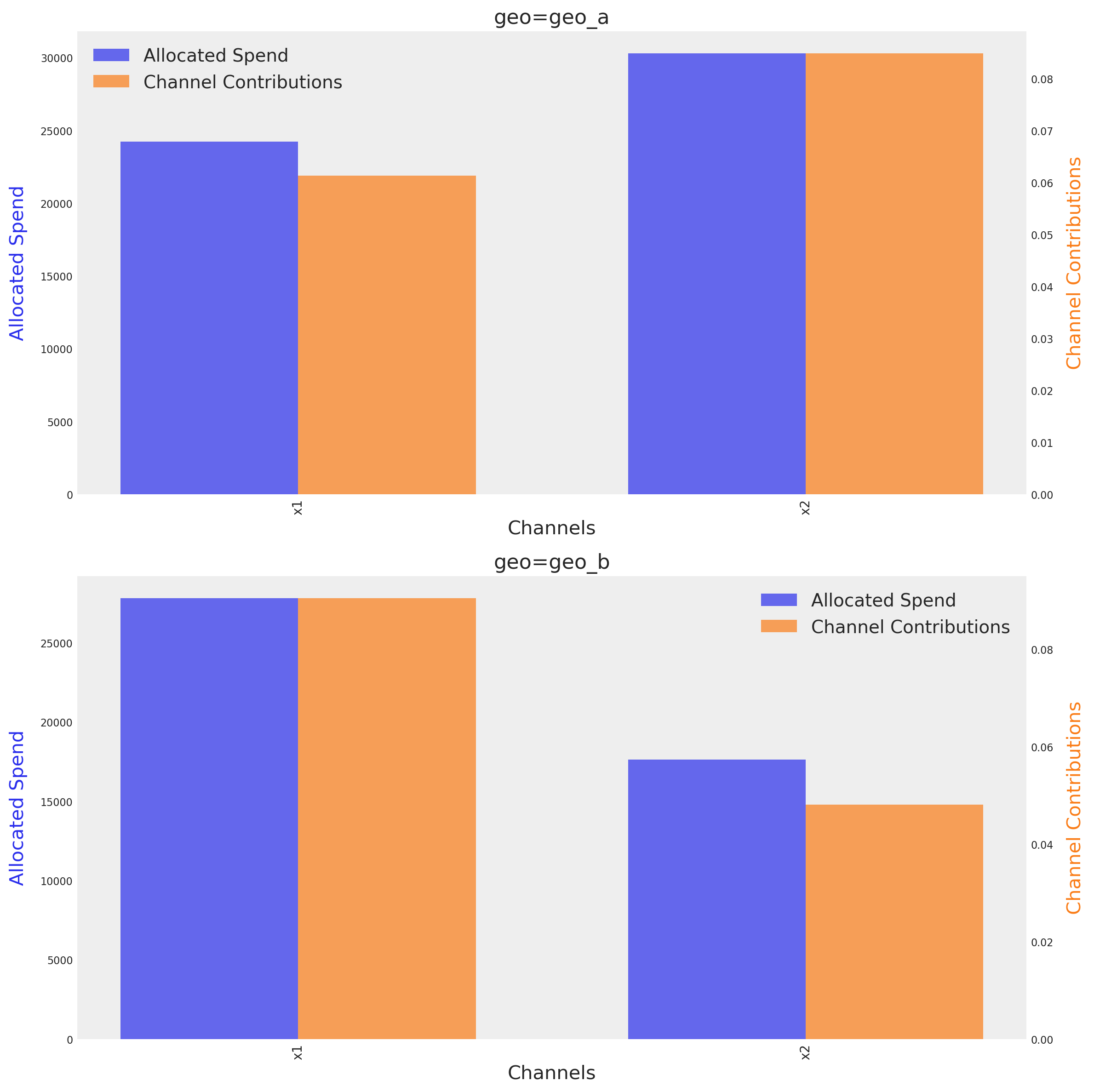 The graph shows the optimal budget for each channel on each geo, next to their respective mean contribution given the optimal budget. The method identify automatically the number of dimensions and tries to create a plot based on them.