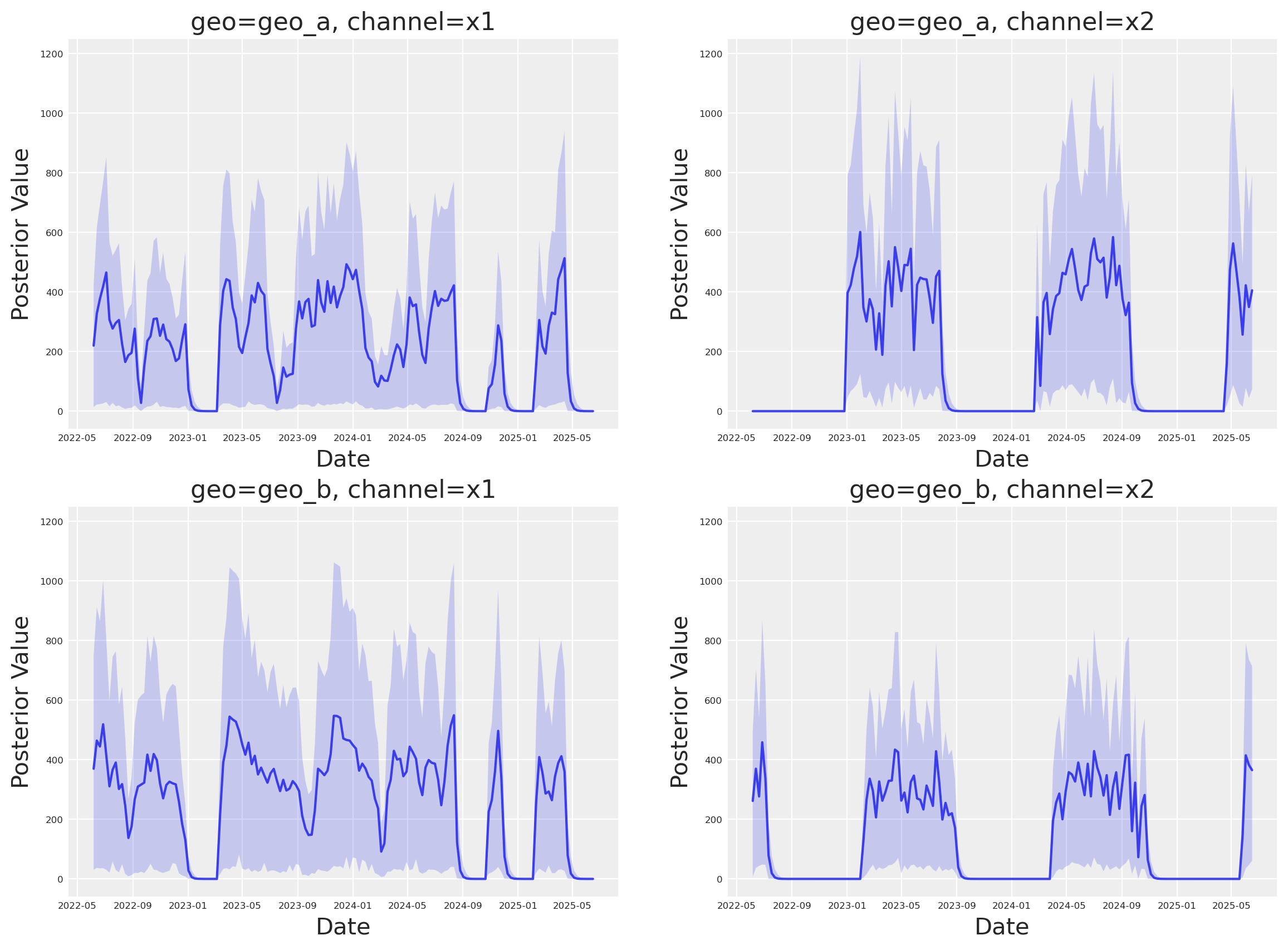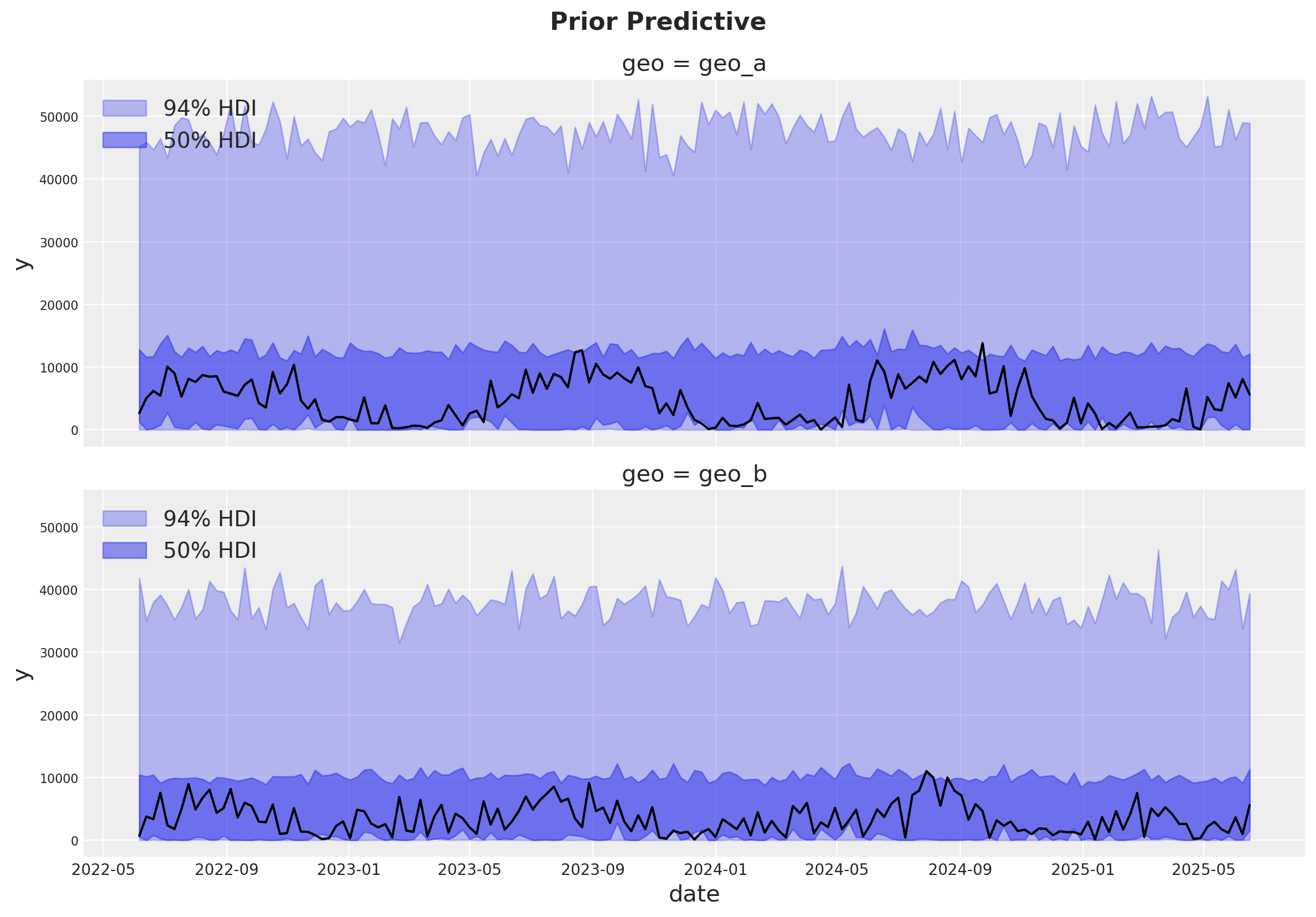 There are a lot of option in how we code up each type of effect. It can be difficult to keep track of which parameters share information, which are completely separate, and which are shared. But there is a trick to help you remember - notice that the interior Priors have fewer dimensions than the main Prior. The extra dimension represents the dimension across which information is transferred. The shared dimensions represent the ones that are independent. Channel 1 in geo_a influences channel 1 in geo_b, but channel 1 never influences channel 2.