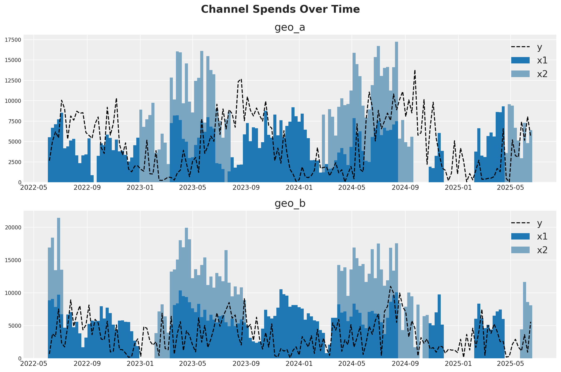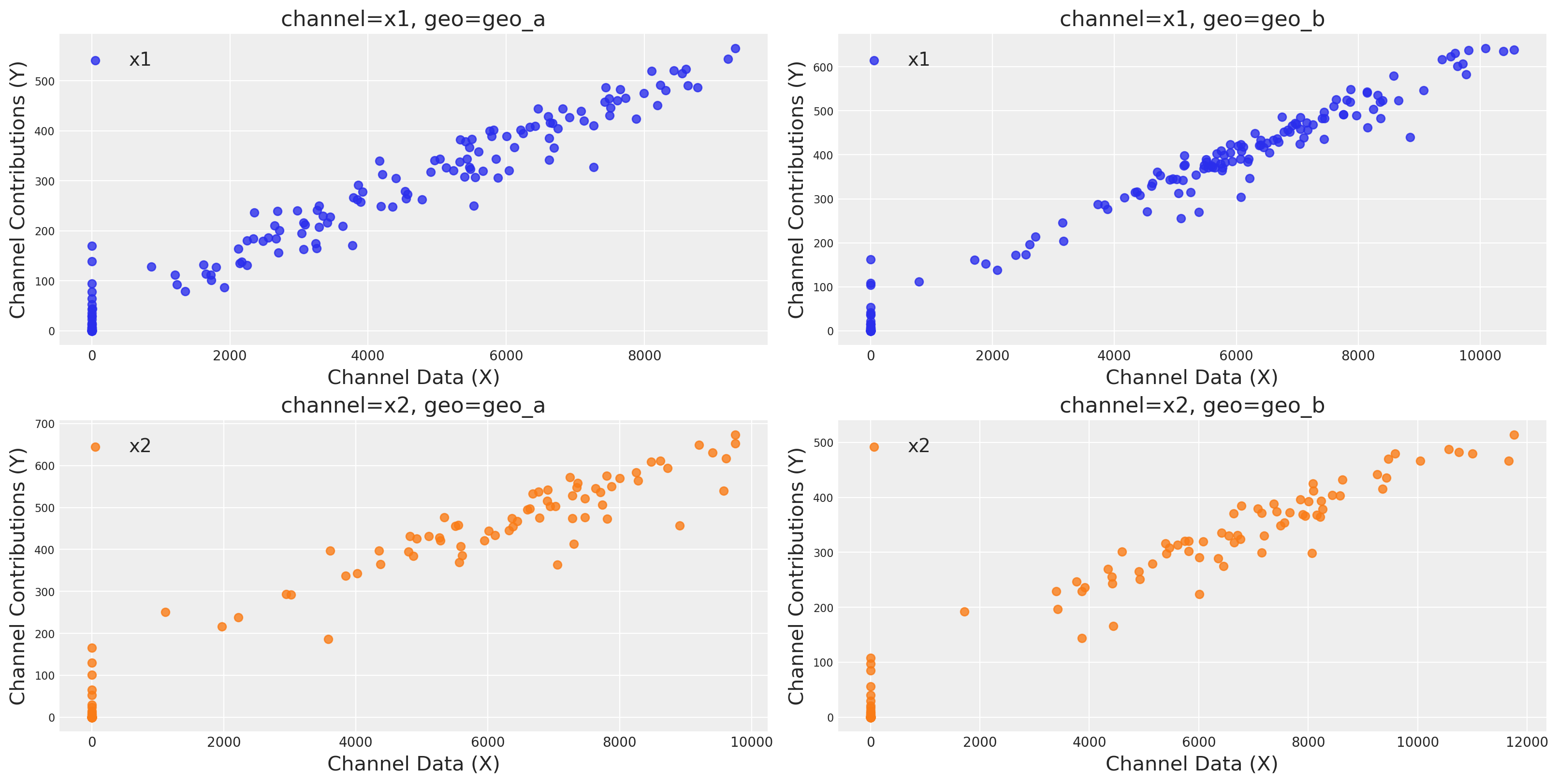 One strategy for dealing with noisy, low-signal data is to borrow information from similar contexts. If channel 2 seems to be pretty effective in geo_b, that gives us reason to suspect it will be effective in geo_a. This can be implemented either with full pooling or partial pooling (partial pooling models are often called ‘hierarchical’ or ‘multi-level’). So this notebook will demonstrate how to fit an MMM to multiple markets at the same time and make decisions about how to pool information across the two contexts.