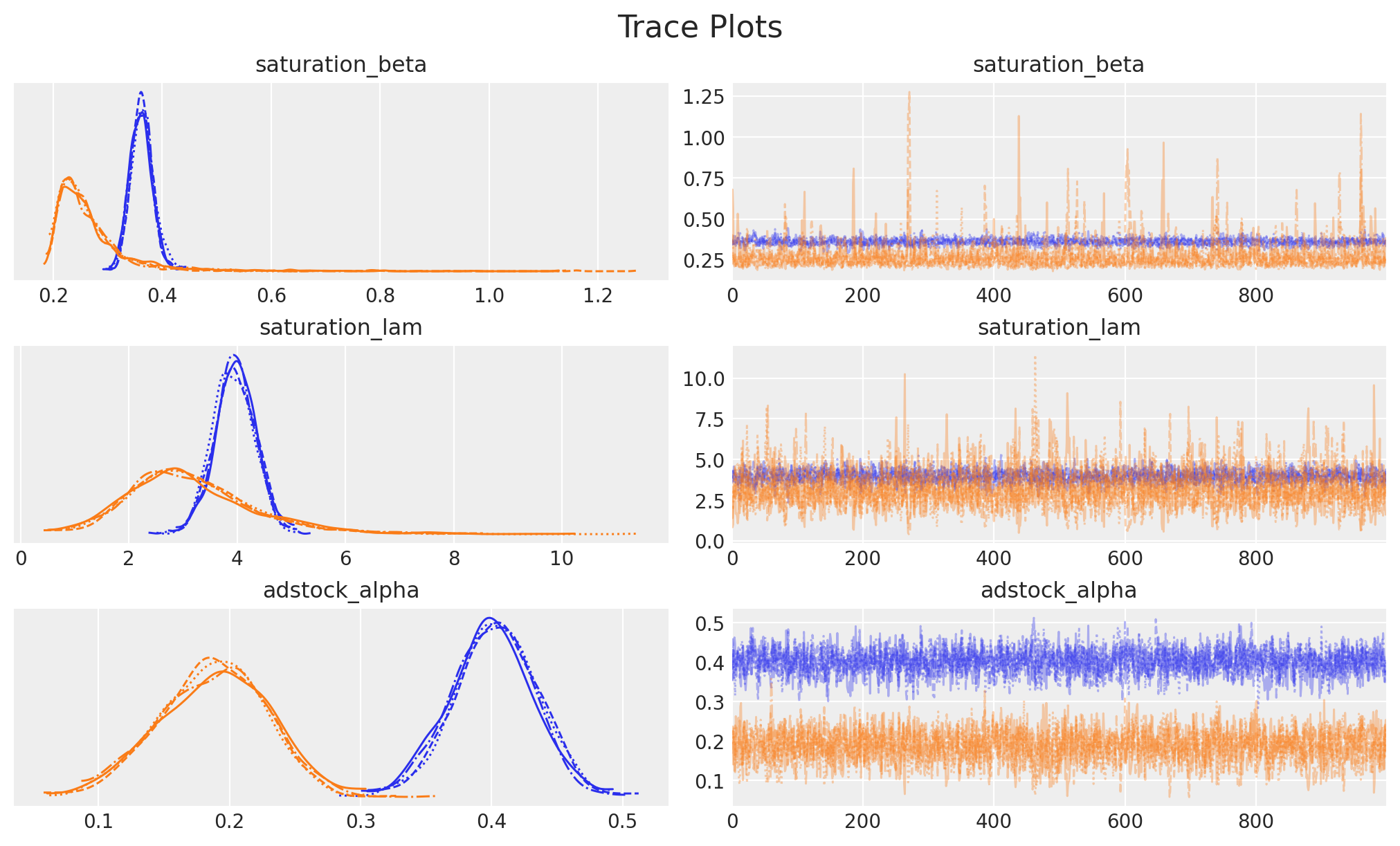 Welcome to PyMC-Marketing! This library provides powerful Bayesian modeling tools for marketing analytics. PyMC-Marketing is built on top of PyMC, a probabilistic programming library that enables Bayesian inferenc. In this quickstart, we’ll walk through fitting a basic Media Mix Model (MMM) in PyMC-Marketing.