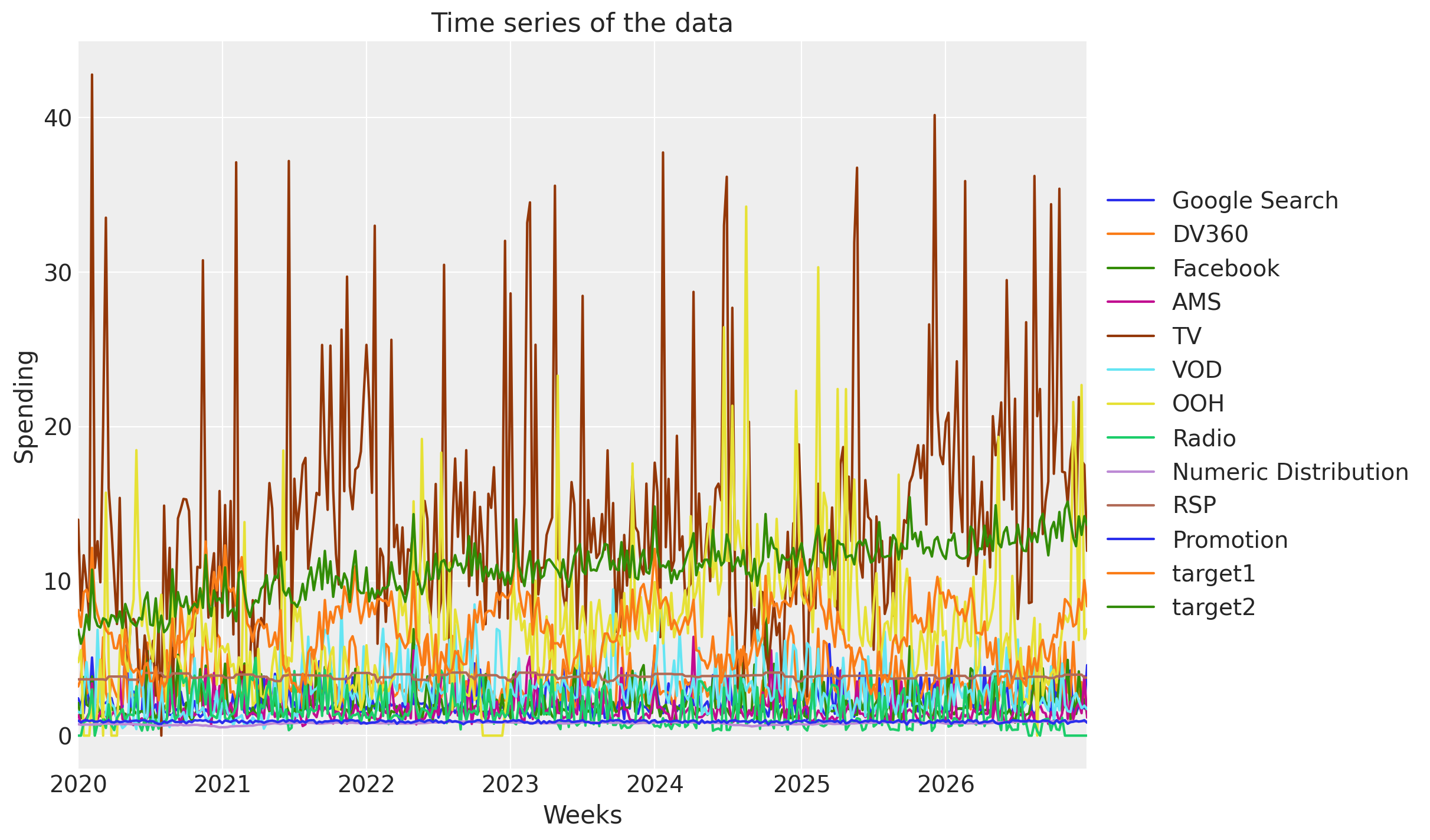 | Weeks | Google Search | DV360 | AMS | TV | VOD | OOH | Radio | Numeric Distribution | RSP | Promotion | target1 | target2 | ||
